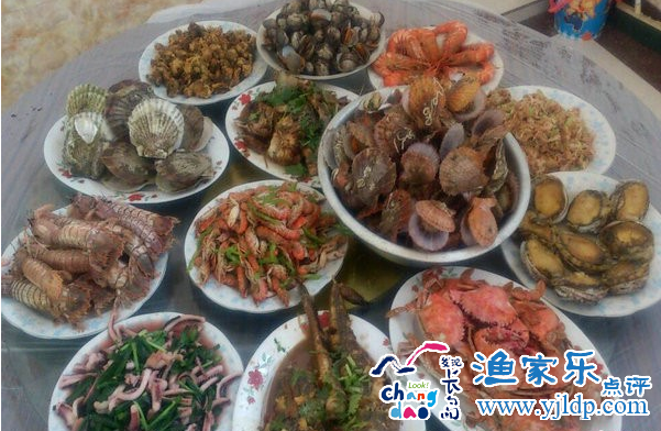 劉園漁家海鮮有 爬蝦、海膽、螃蟹、對蝦、魷魚、八爪魚、扇貝、海虹、牡蠣、海參、鮑魚﹑江珧貝﹑夏邑貝﹑海牛牛﹑海螺等,海蜇湯、 海菜包子、鲅魚水餃﹑各種海魚。純綠色蔬菜,自家1畝菜園,游客可自行采摘。