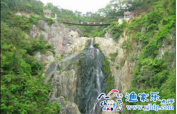 沿著石階登山,不覺間來到觀瀑臺(tái)。站上觀瀑臺(tái)瞭望,鐘潭飛瀑猶如一匹直掛在懸崖上白練,從半空中猛鋪下來(如圖),直搗潭心,水聲轟轟,落在“鐘弦”上,奏出了悅耳動(dòng)聽的樂曲。在漂浮空中的噌響間,我凝神屏氣,似乎被這噌響陶醉了。來到了鐘潭的高處,一道鐵索橋凌空飛架,連接兩側(cè)山崖,美其名曰“鐘潭飛渡”。我站在晃晃蕩蕩的木板橋上,俯瞰潭水影千姿,仿佛感到足下生云漫,一瞬間,全身的每一個(gè)細(xì)胞都充滿著活力。
