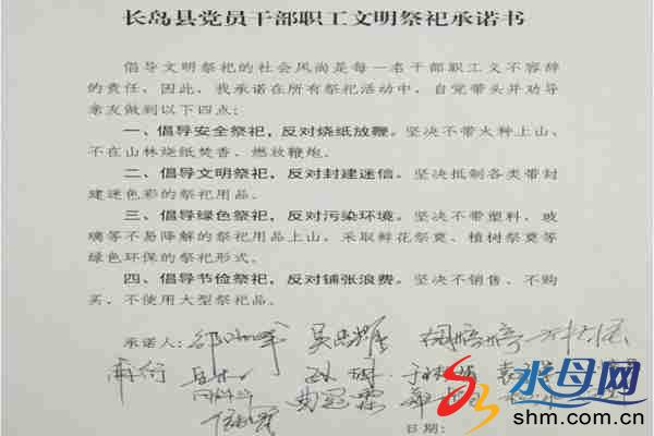 鄉(xiāng)機關(guān)干部紛紛在承諾書上簽字,鄭重承諾:清明期間自覺帶頭踐行移風(fēng)易俗;長島旅游同時向全鄉(xiāng)干部群眾發(fā)出倡議:清明期間安全祭祀、文明祭祀、綠色祭祀、節(jié)儉祭祀,全鄉(xiāng)干部群眾攜起手來共同維護(hù)我們的美好家園。