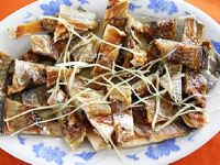 把黃魚(yú)、鱔魚(yú)、粘魚(yú)、扁口魚(yú)等沿腹部割開(kāi),去掉內(nèi)臟不加鹽曬干,當(dāng)?shù)亟邪讜?。“白曬”泡軟蒸熟,色成桔紅,肉質(zhì)不糜不爛,軟硬適中,本味不減,極有咬嚼,便于撕吃,蘸著醋、蒜、醬油、香油配合的佐料助酒下飯,其鮮、香、酸、辣俱備,有品不無(wú)的野味。白曬,亦可烤吃,是長(zhǎng)島民宿...