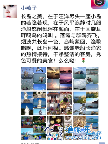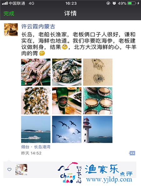 人生中第一次坐船,感覺(jué)很特別,站在圍欄內(nèi),海風(fēng)輕輕吹拂,海鷗只只從頭頂飛過(guò),閉上眼,享受片刻美好時(shí)光。決定去長(zhǎng)島的時(shí)候,家人們有一定的擔(dān)心,一個(gè)四面環(huán)海,與外界需要船只往來(lái)的小島,值得去嗎?結(jié)果,大家個(gè)個(gè)都是滿意而歸。首先入住的漁家,環(huán)境清新雅致,處處都是小用心,床單被子都超級(jí)干凈舒適,衛(wèi)浴也很完善,與酒店無(wú)異。因?yàn)闈O家是吃住在一起,省去了我們外出吃飯的麻煩,超級(jí)貼心。飯菜的味道也美味的不得了。每餐都是不一樣的感覺(jué),頓頓海鮮不重復(fù),絕對(duì)的新鮮食材,爭(zhēng)相逃跑的螃蟹個(gè)個(gè)被抓了回來(lái),哈哈,太有意思了,活得鮑魚也開(kāi)始逃生,一點(diǎn)點(diǎn)蠕動(dòng)的身軀,竟然也能翻越高高的盆沿逃掉。小林相當(dāng)有耐心,一點(diǎn)點(diǎn)把長(zhǎng)島的風(fēng)土人情,景區(qū)地貌給我們介紹了一遍,方便我們選擇去哪里玩。時(shí)間真的過(guò)的很快,轉(zhuǎn)眼我們回家也有幾天了,一直對(duì)那個(gè)小海島念念不忘,對(duì)老船長(zhǎng)漁家,小林和他對(duì)象倍感親切。全家人都說(shuō),以后如果有機(jī)會(huì),一家人一定再去長(zhǎng)島走一遍,真心滿意,為大家推薦!