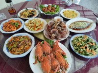 四號(hào)出發(fā)和同事一行五人住在昊客漁家,漁家去碼頭接的我們。一進(jìn)小院小張就很熱情迎上來(lái),帶我們看房間,每年都出去玩住的是客棧,真就趕不上小張家的漁家樂(lè)。安排好房間,我們還不餓,就去趟九丈崖,離昊客海家不遠(yuǎn),步行幾分鐘就到了。在海邊玩了一會(huì),買點(diǎn)紀(jì)念品。就回去了,到院子一看一桌豐盛的飯菜,還真有點(diǎn)餓了。