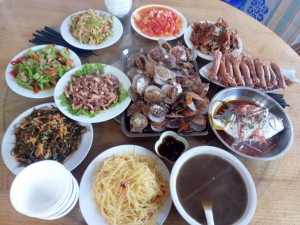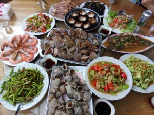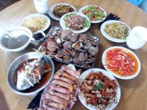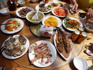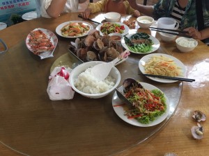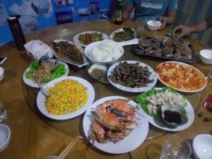 每頓正餐都是五菜一湯,人多菜多,海鮮素菜搭配,海鮮都很新鮮。這個(gè)大扇貝里有個(gè)小螃蟹,超級(jí)可愛(ài)