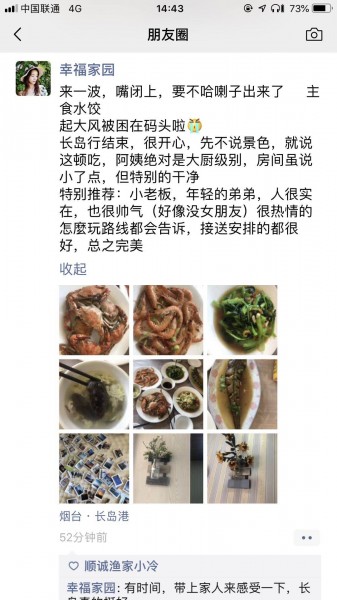 剛從長島回來,就上來評價一下,順誠漁家的確給我們留下了美好印象。長島幾年前就去過一次,這次去長島變化很大,漁家樂也比以前多的多了。在網(wǎng)上看的眼睛都挑花了,選擇順誠漁家是看他們家地理位置我喜歡,離海邊近,我們下了船小冷開車去碼頭接的我們,小冷很熱情。到了漁家也沒失望,房間裝修我都很喜歡,漁家院也很干凈,我有點小潔癖,所以很注重這些。漁家的飯菜做的也很地道,菜量很足,都吃不完,味道新鮮,牡蠣 螃蟹 皮皮蝦都特別肥。出門在外能選擇這樣的店還是很幸運的,能休息好也能吃的好,小冷還按我們的時間給我們安排游玩路線,很感謝小冷一家熱心的給我們講解。因為我們是兩家人一起出來玩,全部是我負責找漁家,就擔心找的不好,這家真的很給力!吃 住安排的都很好,朋友圈里看到這些海鮮都饞死了推薦朋友到這家。