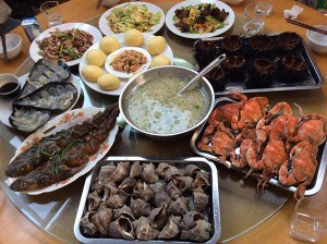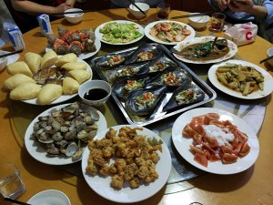 再說飯菜。我們哥幾個人,住了三天,吃了9餐,早餐雞蛋、咸魚、玉米粥,中午晚上都是9、10個菜,各種生猛海鮮不重樣,給力給力。