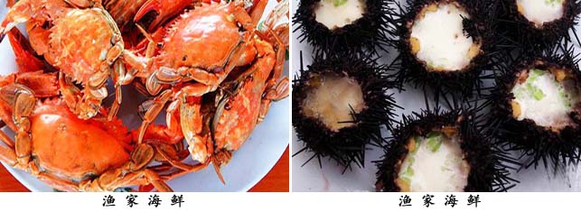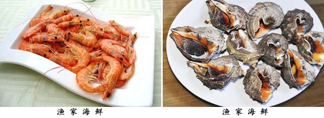 海鮮主要有:爬蝦 、螃蟹、對蝦、 魷魚、八爪魚、 扇貝、 海虹、 牡蠣等,海蜇湯、 海菜包子、 鲅魚水餃還有各種各樣的魚類。