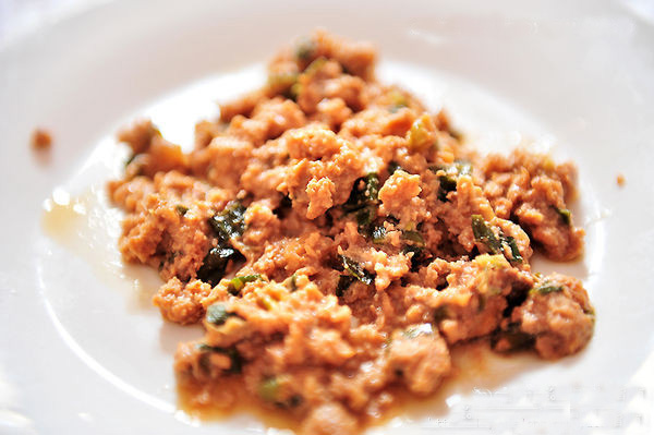 當(dāng)天的海膽雖然新鮮,但是并不太肥,于是老板娘細(xì)心地加入雞蛋和蔥末,與絞碎的海膽肉同蒸,海膽的鮮咸中夾雜著雞蛋的甜香和蔥的清香,融合得恰到好處。吃到嘴里,不但味道更充實(shí)豐富,口感也更柔軟綿糯。老板娘還給這道菜起了一個(gè)好聽的名字——芙蓉海膽。