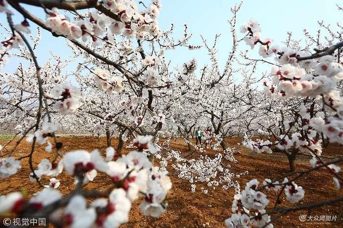 游客在杏園里拍到山東旅游攝的杏花