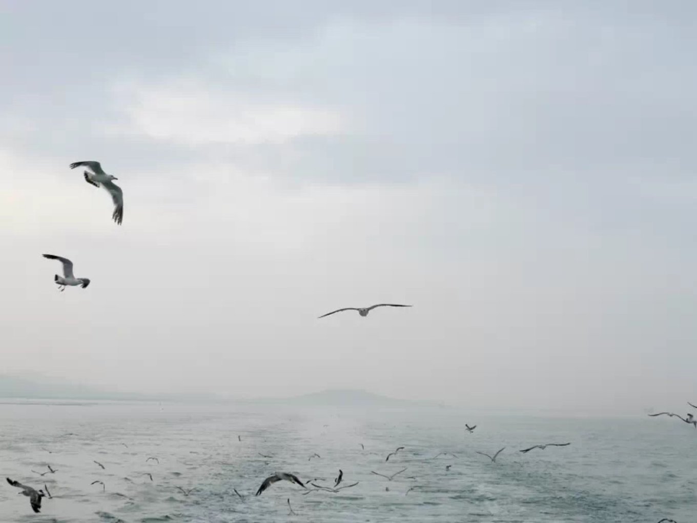 很多游客把面包和方便面扔出去喂海鷗,海面上有很多食物,聰明的海鷗不飛了,它們直接在水上撿來吃。