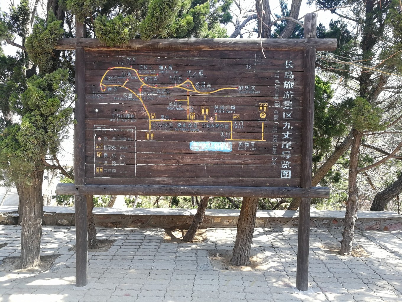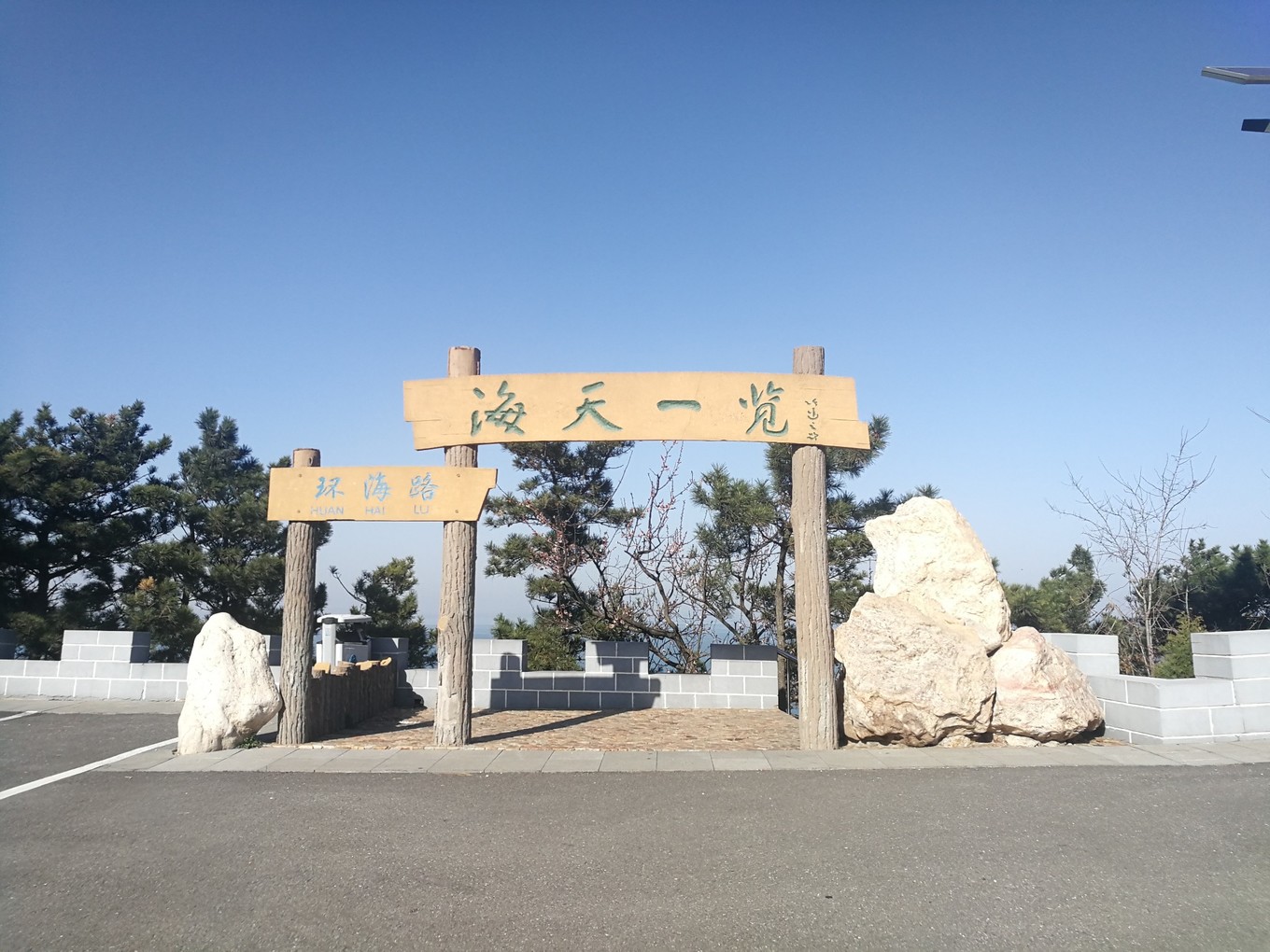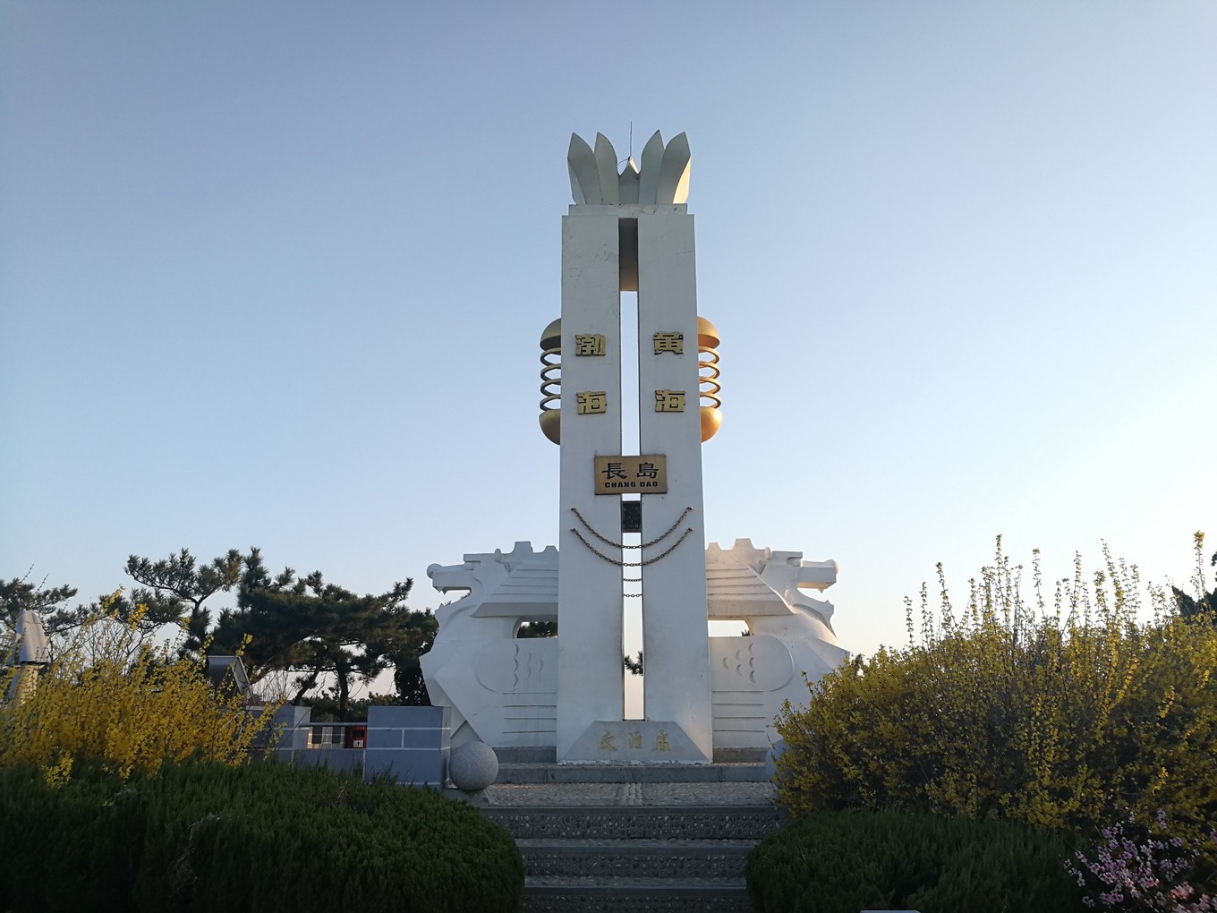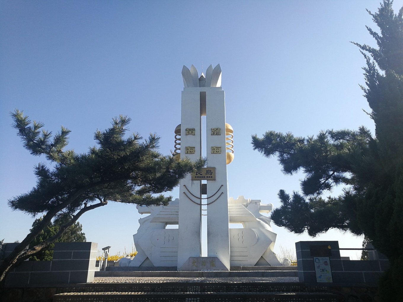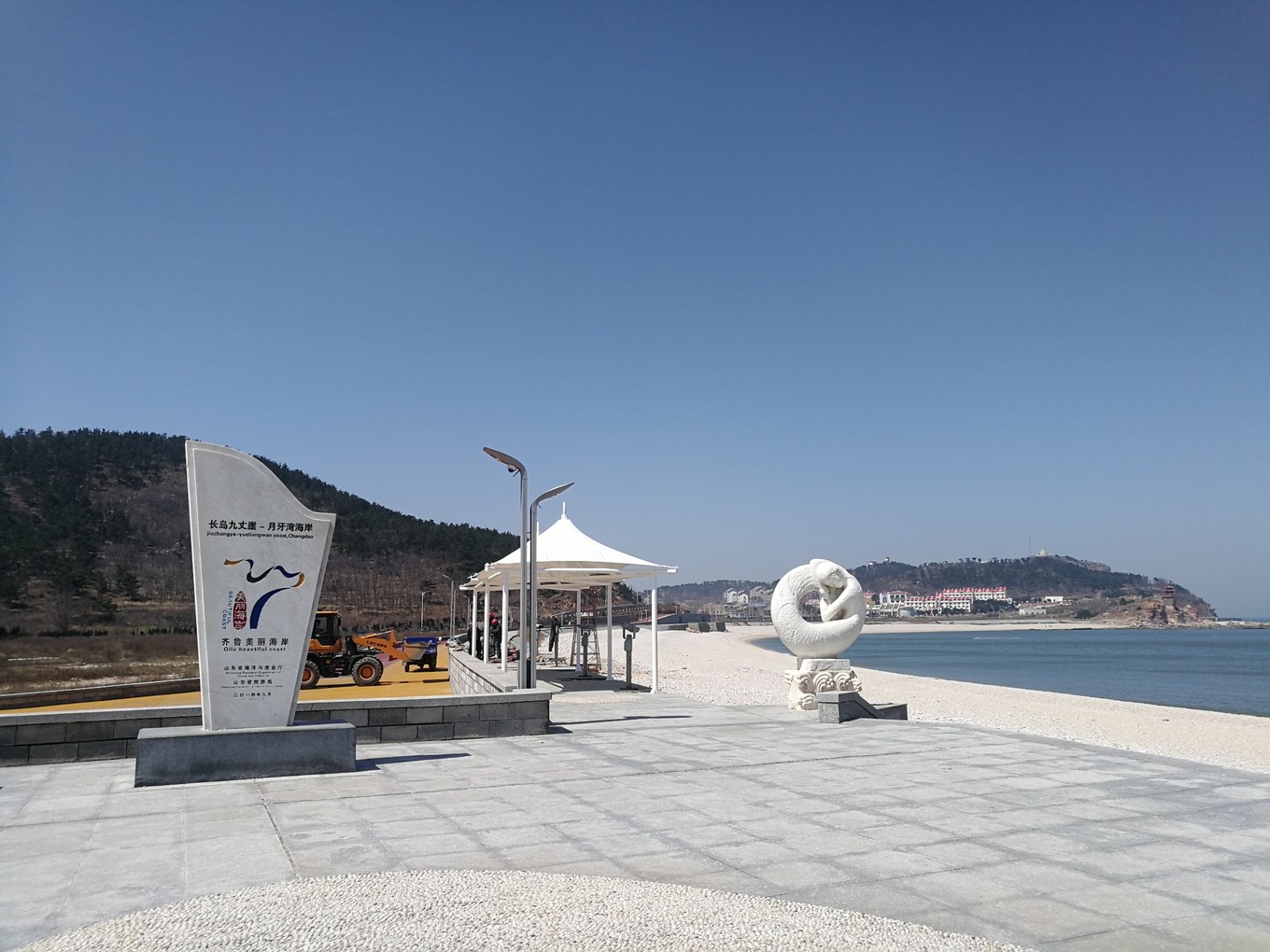 逛了一圈下來(lái),只有游步道處的兩座白玉石雕和月牙灣公園的石碑可做留念,公園中所謂的“主要建筑”,有一座高20余米的中西結(jié)合式的“月牙亭”,看似無(wú)人管理;還有說(shuō)矗立在峭壁之上的“觀瀾亭,也沒有找到……此外還有一條長(zhǎng)約千米的長(zhǎng)廊以及用球石鋪筑的百米“石毯”也沒有尋到其蹤跡……對(duì)于長(zhǎng)島縣旅游宣傳的真實(shí)性真的有待考證啊??!