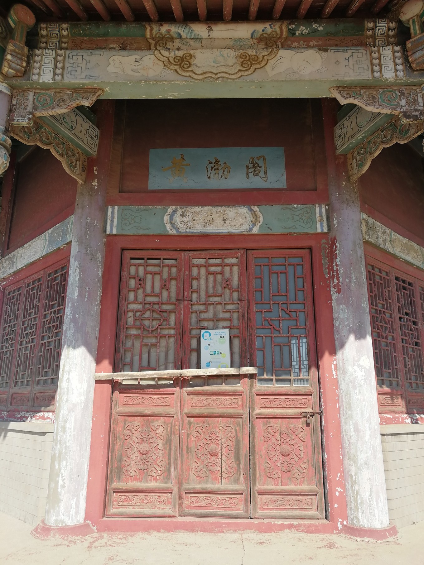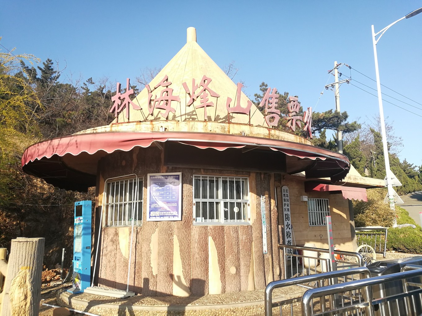 景區(qū)的大門是白玉浮雕的牌坊,入內(nèi)后左側(cè)有一座廢棄的亭閣,名為“黃渤閣”,高約16米,圍欄搭建成防御性的城墻,類似烽火臺(tái),此為制高點(diǎn)。