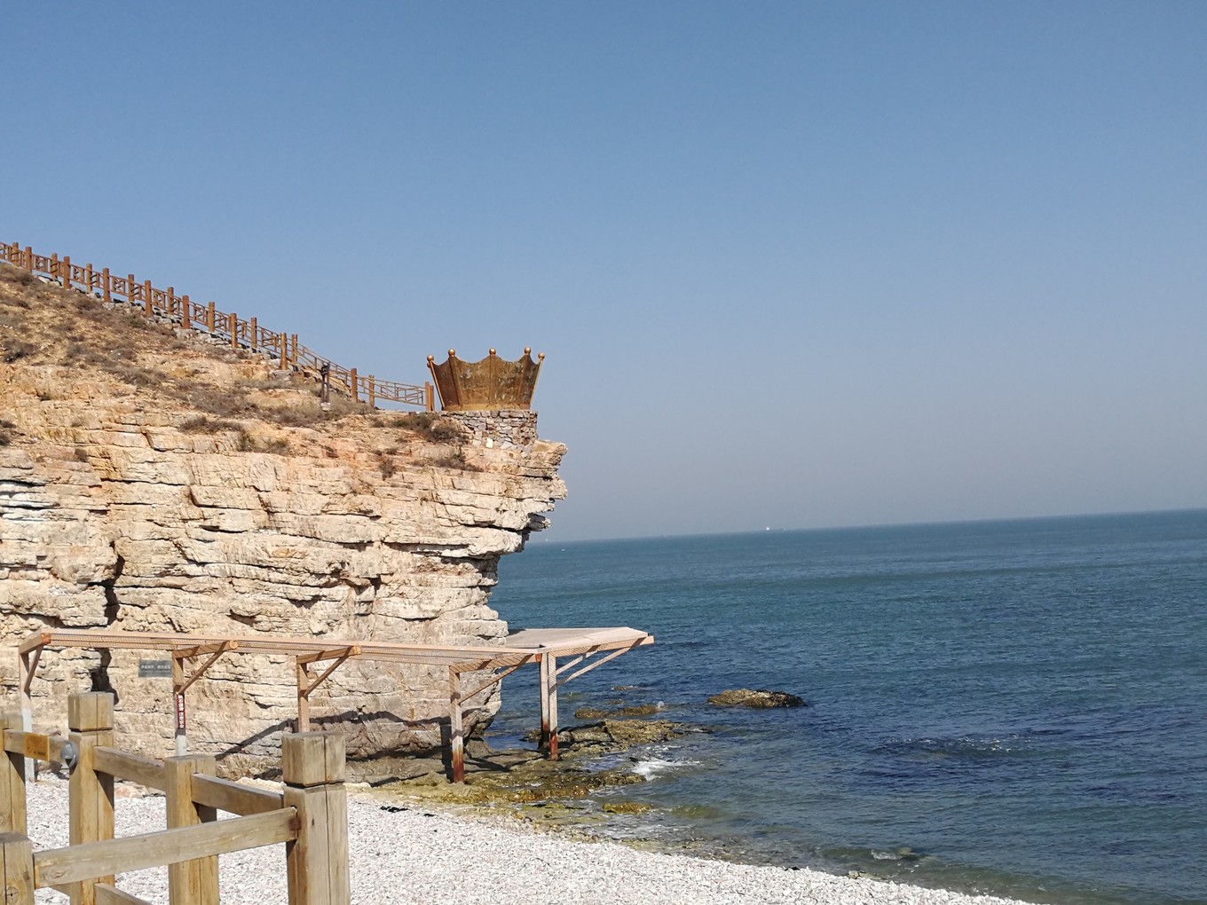 這個(gè)景點(diǎn)在長(zhǎng)島最北端,但車程也不過只有20多分鐘,進(jìn)入景點(diǎn)其實(shí)并沒有很特別,看到海岸線后往左是一段木棧道,遠(yuǎn)處能見一個(gè)銅筑的“皇冠”,類似觀景臺(tái)。步行到小山腰處便是九丈崖的石碑,往前有個(gè)觀景平臺(tái),可賞鷗翅灣風(fēng)景。