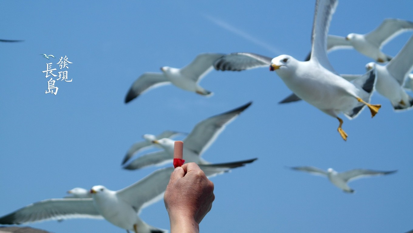 出發(fā)之前,自備了喂海鷗的火腿腸,這時候正好配上用場。一根火腿腸剝了皮,剛伸出去就被海鷗整根叼走了。有的海鷗比較膽小,在食物周圍盤旋了好久,確定安全以后,才會怯怯的張開嘴巴。