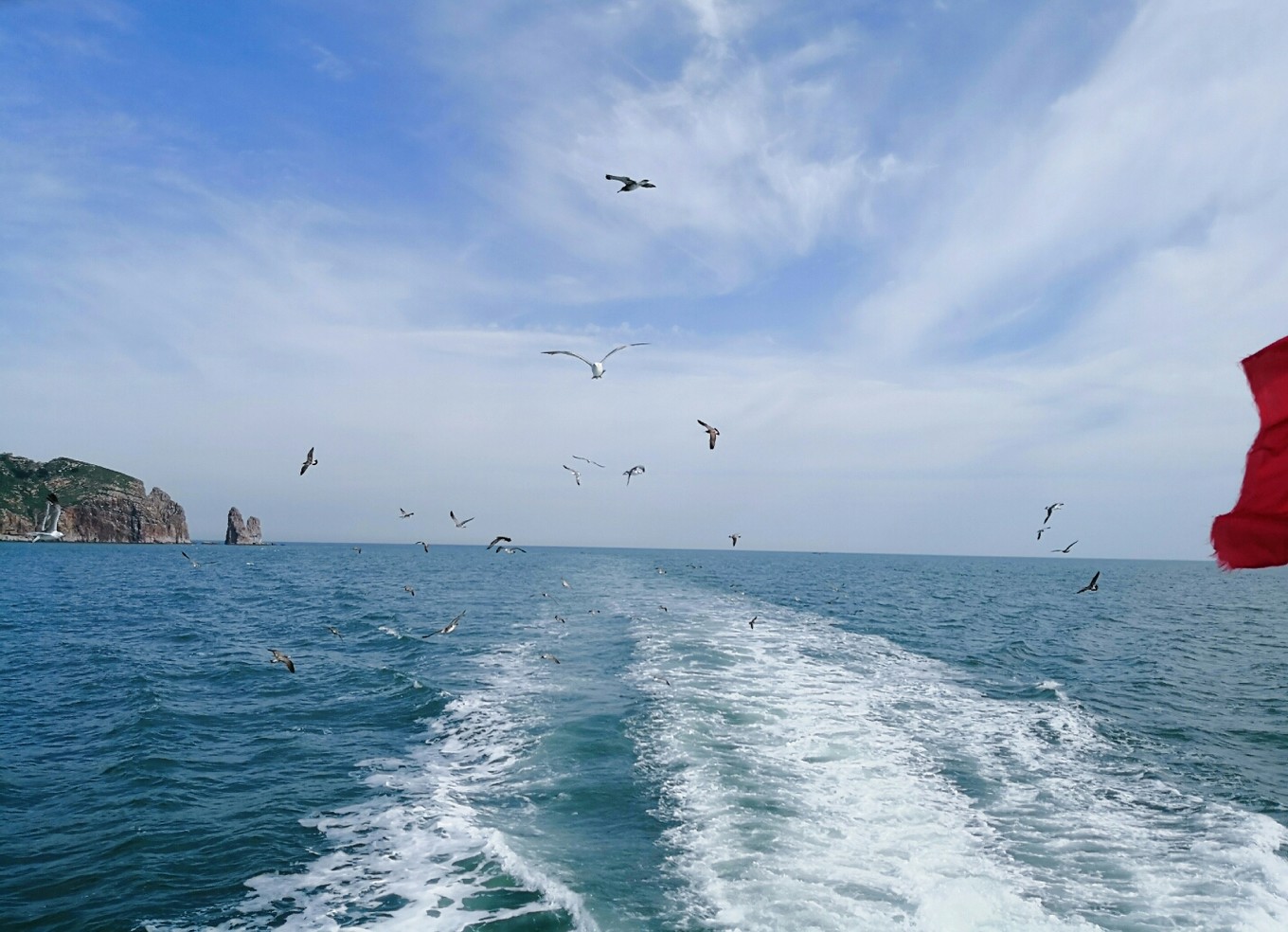 起航?jīng)]過(guò)多久就有成群結(jié)隊(duì)的海鷗跟著船盤旋了,等待著游客們的投喂,我們也帶了一包火腿腸,撕開(kāi)后向天上拋出去,海鷗們一接一個(gè)準(zhǔn)兒,把火腿腸拿在手中伸向天空,一不留神就會(huì)被膽大的海鷗們叼走。