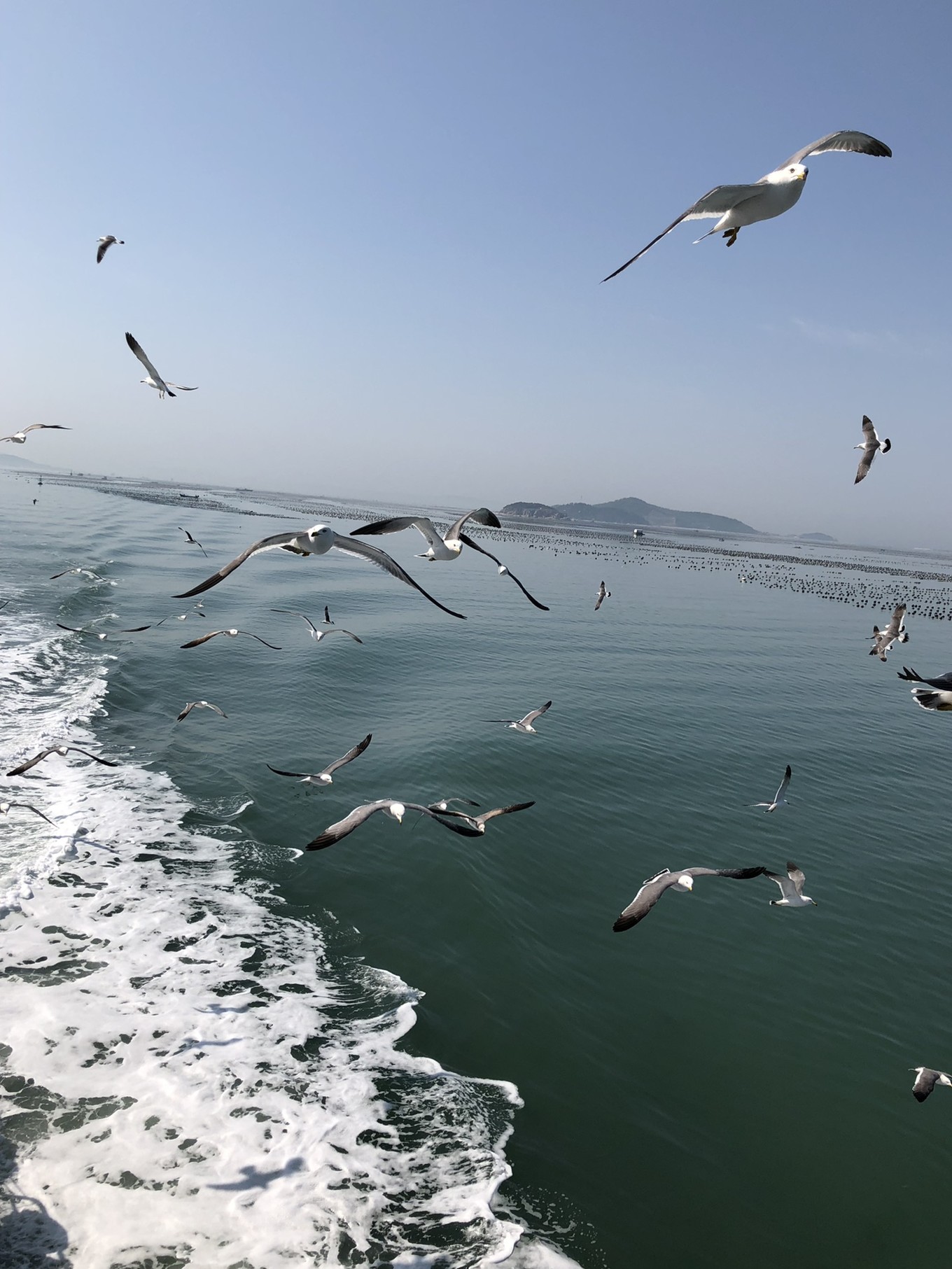 上島第二天,我上船去了萬鳥島。聽漁家樂老板說,海鷗喜歡火腿腸,會一直跟著咱們的船,出海前,我特意買了幾包火腿腸,期待著海上精靈的到來!