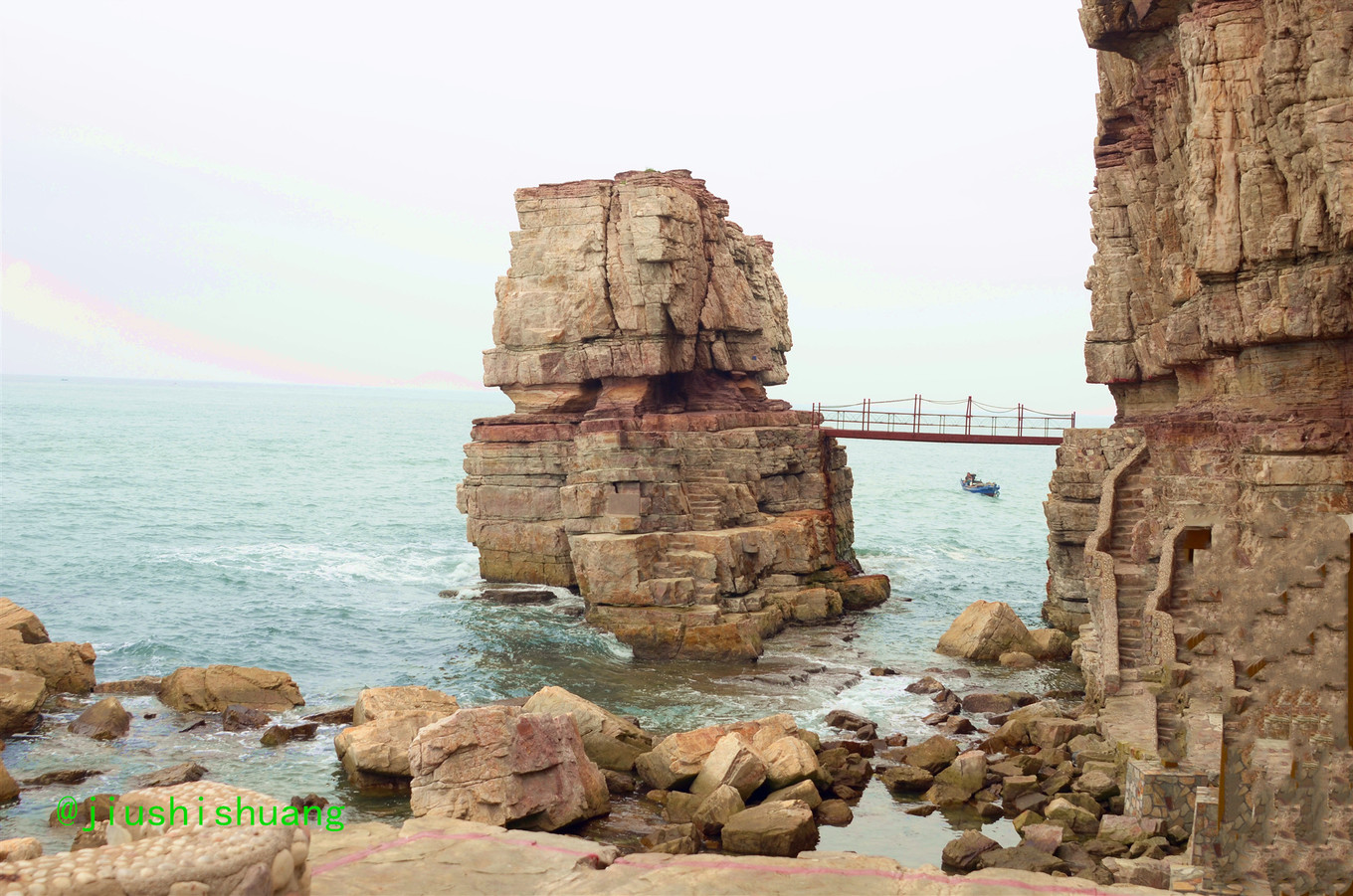 從山頂下來,就到了龍爪山的西端,這里有一座兀自矗立于海上的方形石體,石體的四壁垂直入海,石體的上方有一天然形成的通透石洞,非常神秘吸睛。龍爪山的西端還有一個我國最大海蝕洞——聚仙洞,傳說是八仙過海時的聚會之處,由于時間都用在拍照上了,所以沒有時間進洞看仙兒啦。