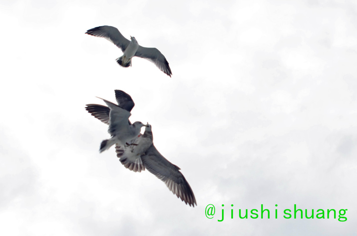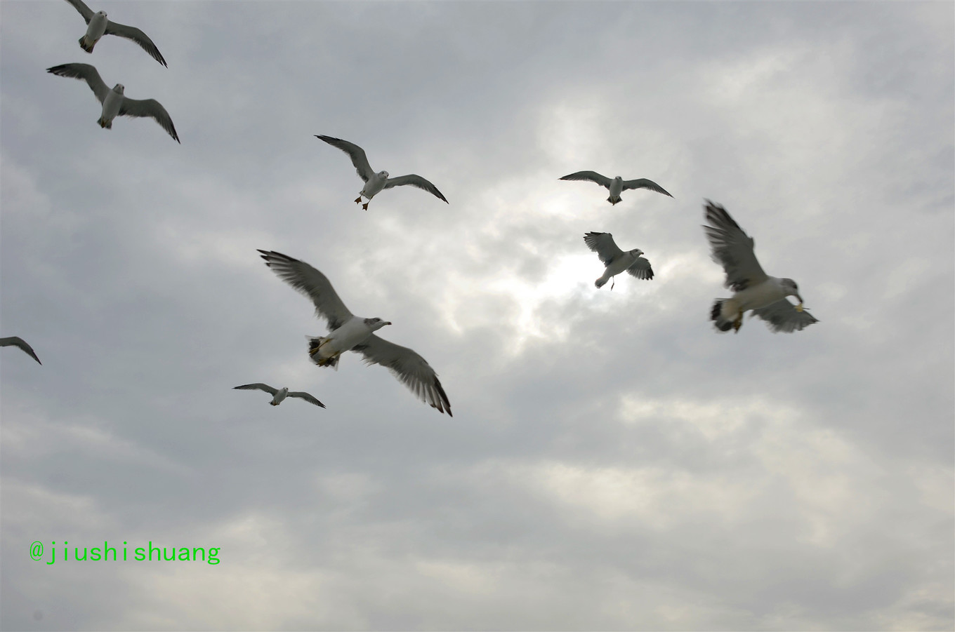 海上游不光是看海看景,還有就是看鳥。九月份長島的10萬多只候鳥已經(jīng)遷移,隨船海鷗還是有的,我們?yōu)榱丝带B喂鳥,特意升艙,站在上層甲板上仰頭觀看,成群海鳥在我們頭上飛來飛去,大家喂鳥的火腿腸用完了,就拿出從北京帶的火燒烙餅喂鳥,請欣賞一下鳥與火腿腸烙餅漫天飛的場面吧。