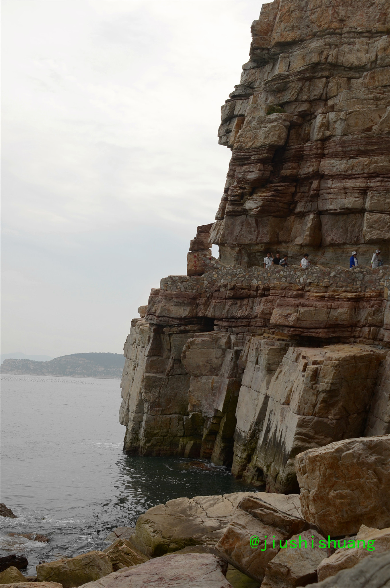 龍爪山高峻險峭,巨石嶙峋。峭壁斷崖的腰部有一條世界最長且極為罕見的天然海蝕棧道。走在海蝕的天然棧道上,我們感受著大自然的鬼斧神工,奇、險、美,一步一景,經(jīng)過將軍石、石門,海蝕棧道被一片嶙厲的巖石阻斷,只好沿著天梯石階上行,爬上山頂居高臨下俯瞰大海,風景這邊更好。