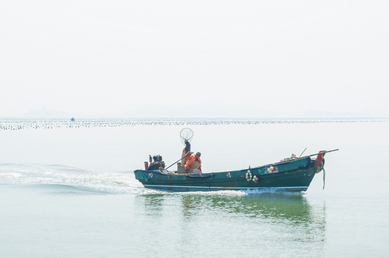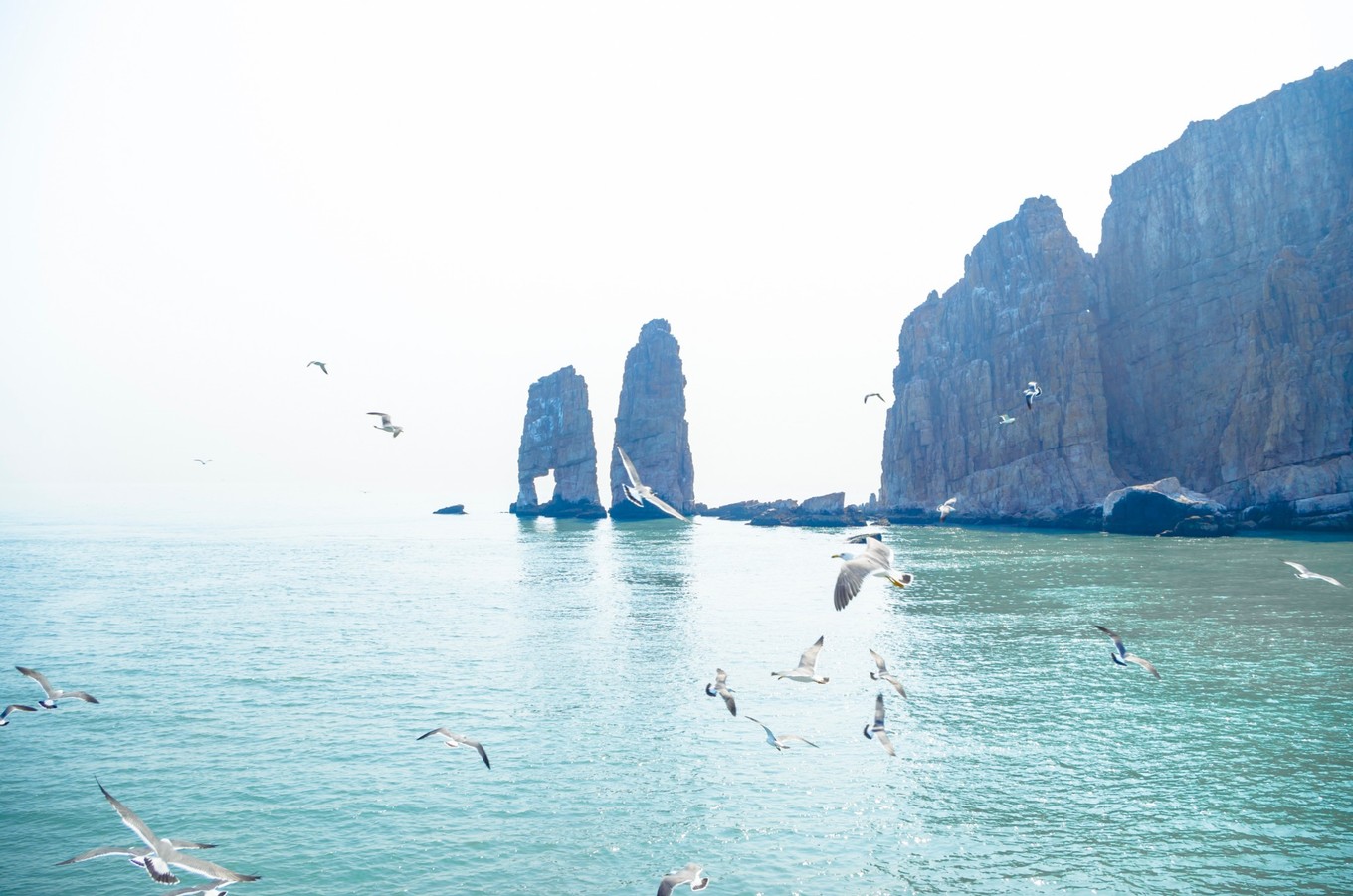 中午的時候,海面上還有些霧氣。遠(yuǎn)方的海面上有條紅色的船,襯著看得不太清楚的水汽,也多出來幾分藝術(shù)家的氣質(zhì)。