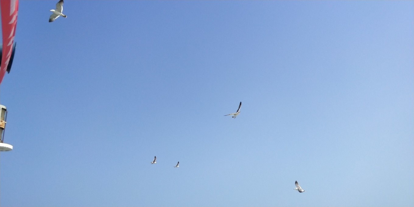 到了港口直接買票,船比來時的小,不知道那些不同號碼的船到底是啥意思,坐了1個多小時才到蓬萊港口。船尾可以看看海鳥,二樓被攔起來要10塊錢才能上去喂鳥,索性就下面看看~