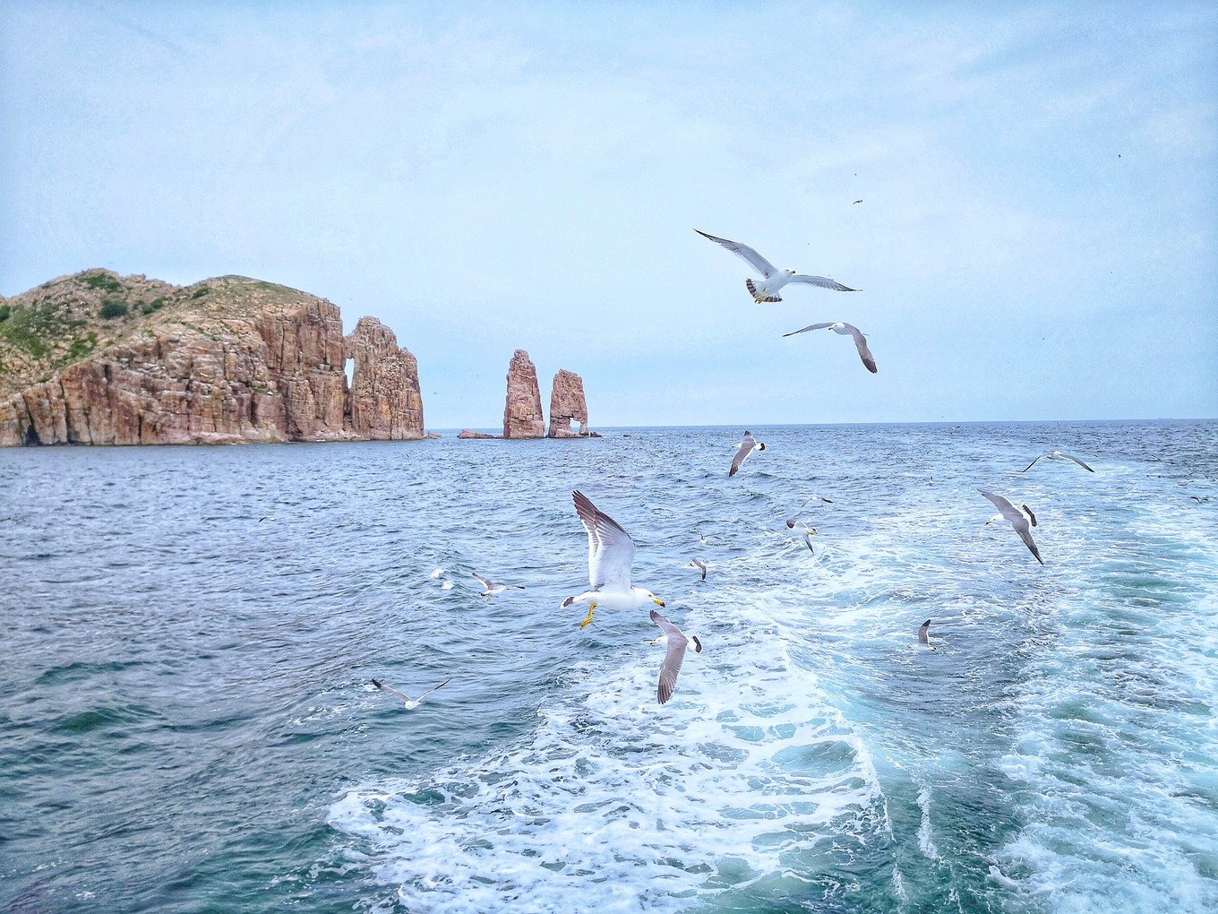 Day3周日:冷大姐提前幫我們預(yù)定了萬(wàn)鳥島的行程,200元航海四小時(shí),到達(dá)萬(wàn)鳥島以后返程,中途登陸廟島,游覽半小時(shí)以后開船一刻鐘就回到長(zhǎng)島啦。長(zhǎng)島是有一家叫做海上游的公司,負(fù)責(zé)我們輪渡和整個(gè)航行行程,途中有講解,還可以喂海鷗。