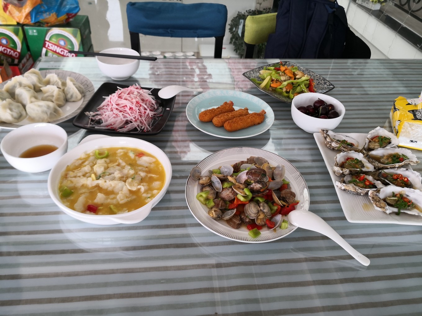 晚餐加住宿。晚餐真的超級(jí)豐盛呀,老板娘冷大姐給我們兩個(gè)人準(zhǔn)備了十盤菜,海鮮特別新鮮,肉質(zhì)鮮美。怒贊黃花魚、鮑魚、海膽和生蠔。大姐調(diào)的醋汁和蘸料味道很好,給海鮮增味了不少。六月剛好是蓬萊的休漁期,但是漁家還可以在近海小規(guī)模打魚,所以海鮮依然是很新鮮的,比養(yǎng)殖的更好吃。我們甚至在扇貝中看到了扇貝生前吃下的小螃蟹,小螃蟹殼是軟的,里面基本沒肉,但是咬開能吃到很嫩的蟹黃,太有意思了。給海膽一萬(wàn)字好評(píng)!
