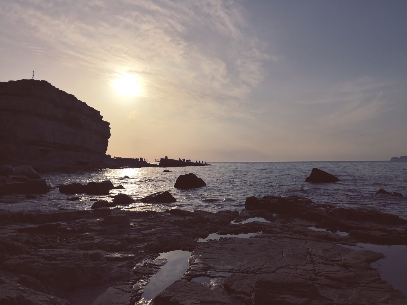 離開月牙灣去九丈崖的時(shí)候已經(jīng)累成狗了,畢竟在鵝卵石上走了將近兩個(gè)小時(shí)。所以看到九丈崖的n多臺(tái)階時(shí)內(nèi)心基本是崩潰的。我們大概五點(diǎn)半到九丈崖,夏天日落比較晚,我們一路走走歇歇基本快七點(diǎn)才到眺望臺(tái),找了塊視角不錯(cuò)的礁石,坐在上面看日落,等了好久才等到日落。天氣不錯(cuò),特別給力,沒有下雨沒霧氣。日落很美,太陽(yáng)把云彩染成了溫柔的粉色。太陽(yáng)接近海面后,過了不到一分鐘就完全落下去了,現(xiàn)場(chǎng)看到真的很震撼,不枉我們餓著肚子看完日落。日落后返程的時(shí)候才發(fā)現(xiàn)珍珠港前面山坡上的燈塔附近看落日視野更好,建議大家不要都擠在眺望臺(tái)的礁石上,后面的視角更好呢。