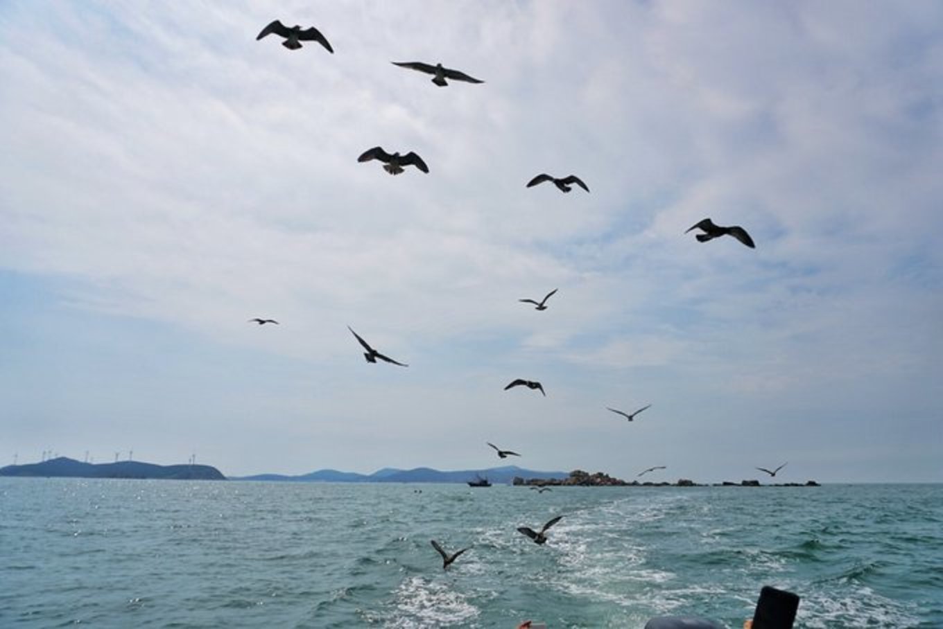 在開去大黑島的路上,驚喜的一幕發(fā)現(xiàn)了,有只海鷗跟隨著我們,大叔說,誰手里有香腸,把香腸拋向空中,海鷗能吃到,到時(shí)成群的海鷗都會(huì)跟隨來。我們把之前房東提醒準(zhǔn)備好的香腸拿出來,扔向空中,一只海鷗來了,兩只,三只,四只,成群的都來了。。。