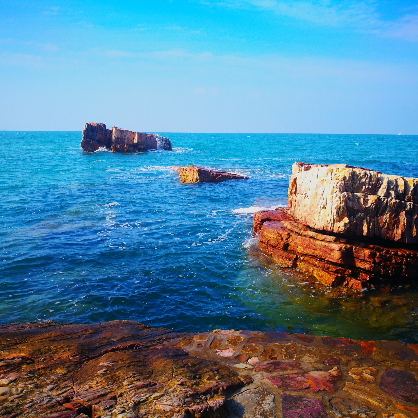 青色蒼穹襯托著蔚藍(lán)的海面,海浪輕輕拍在礁石上,激起白色的浪花,像一把把珍珠撒向海面。