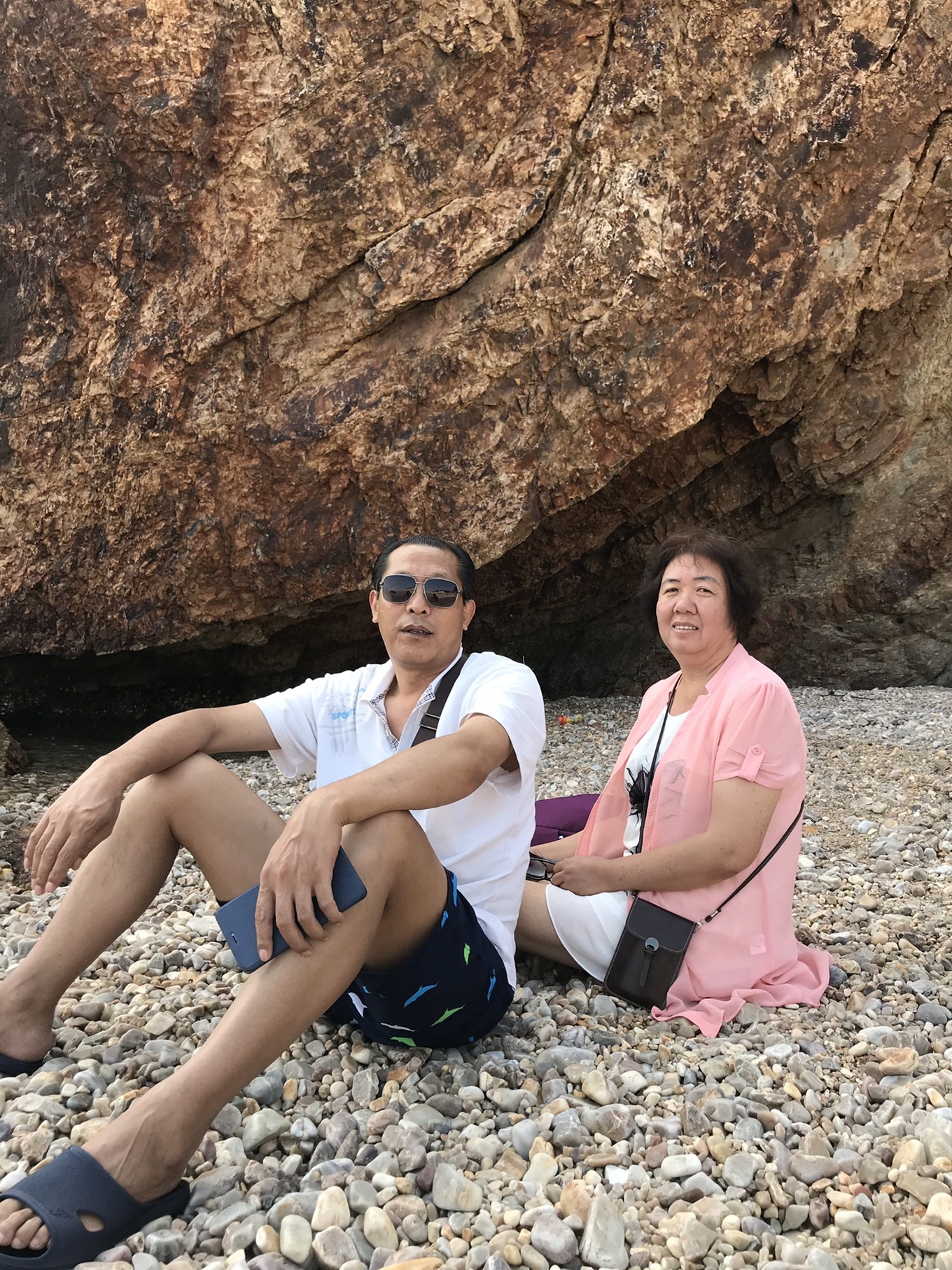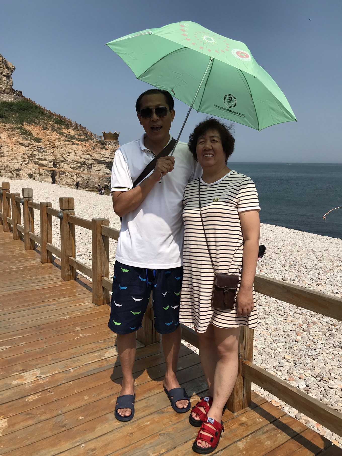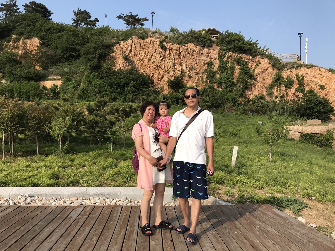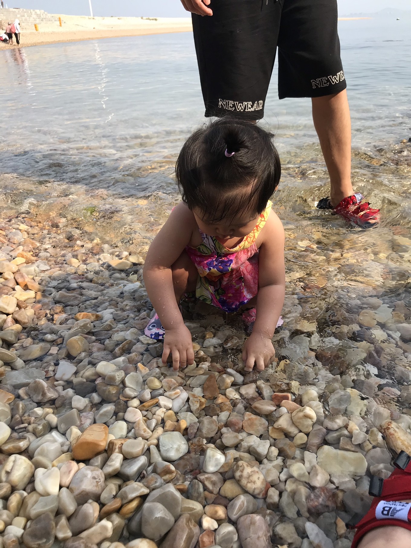 渤海這邊海水很清澈,依依踩著海水扔石子!
