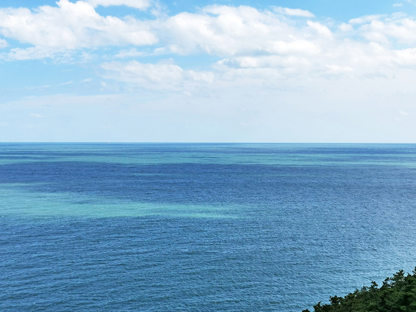 往北看,這里應該也有一條分界線,從長島經(jīng)過廟島一直連到大連的旅順。不過這邊更看不出海水的分野了,這顏色的區(qū)別不是分界,而是海的深淺、陽光透過云層的照射與海中藻類共同作用的結(jié)果。