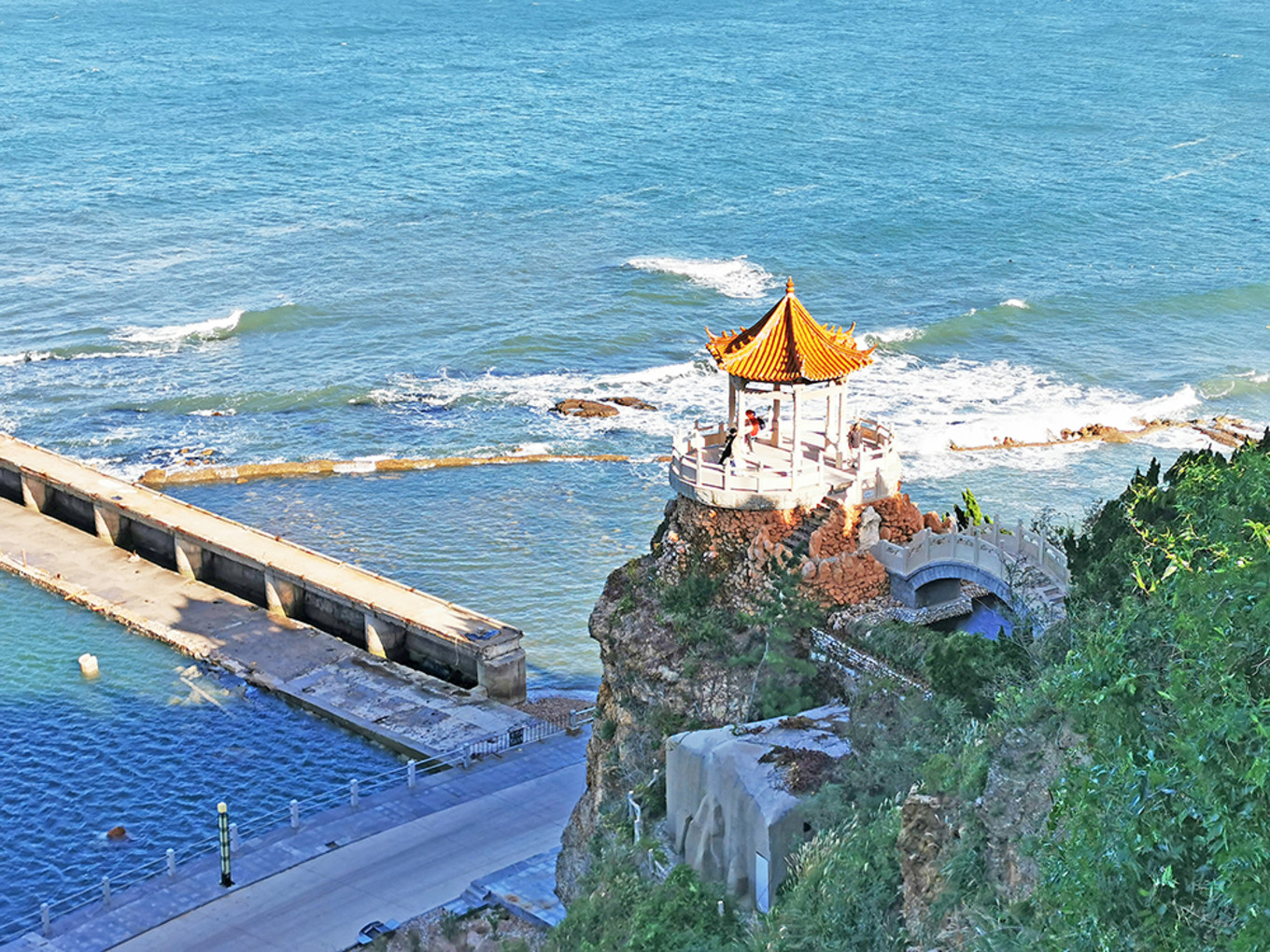 在亭子上俯瞰海邊棧道,感覺風景很美的樣子。