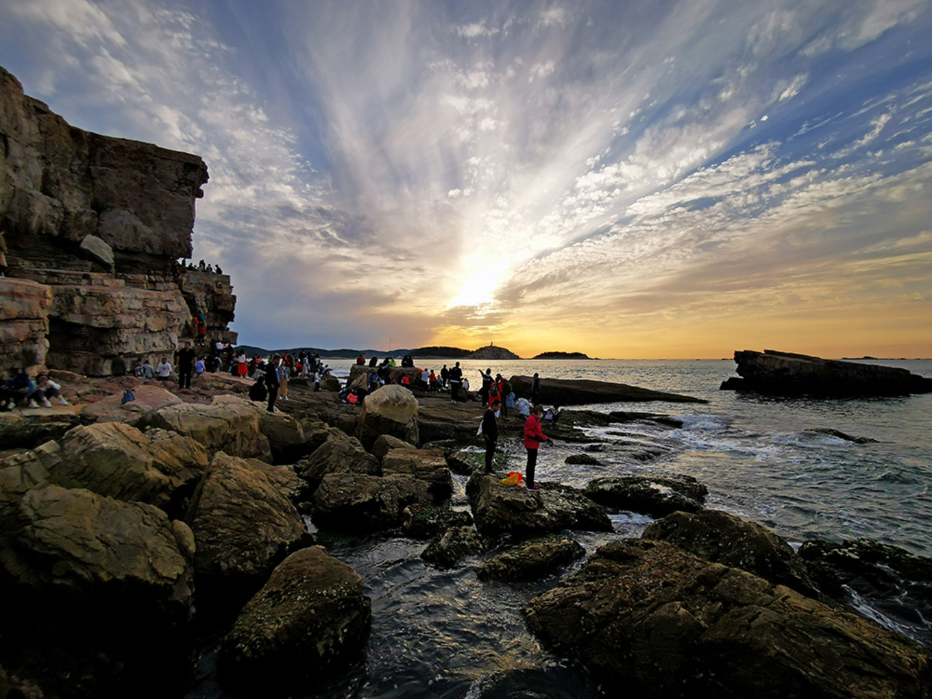 遠處霞光萬道,而近處海潮拍打礁石,海風濤聲齊鳴,云影天光一色,竟讓我想起了小時候看過一篇不知名的小說:在某個海峽之角,主人公站在絕壁之巔,見夕陽隱去,聽浪濤拍崖,覺天地孤寂蒼茫,想身世沉浮寥落,當真有遺世獨立,凄迷萬狀之感。