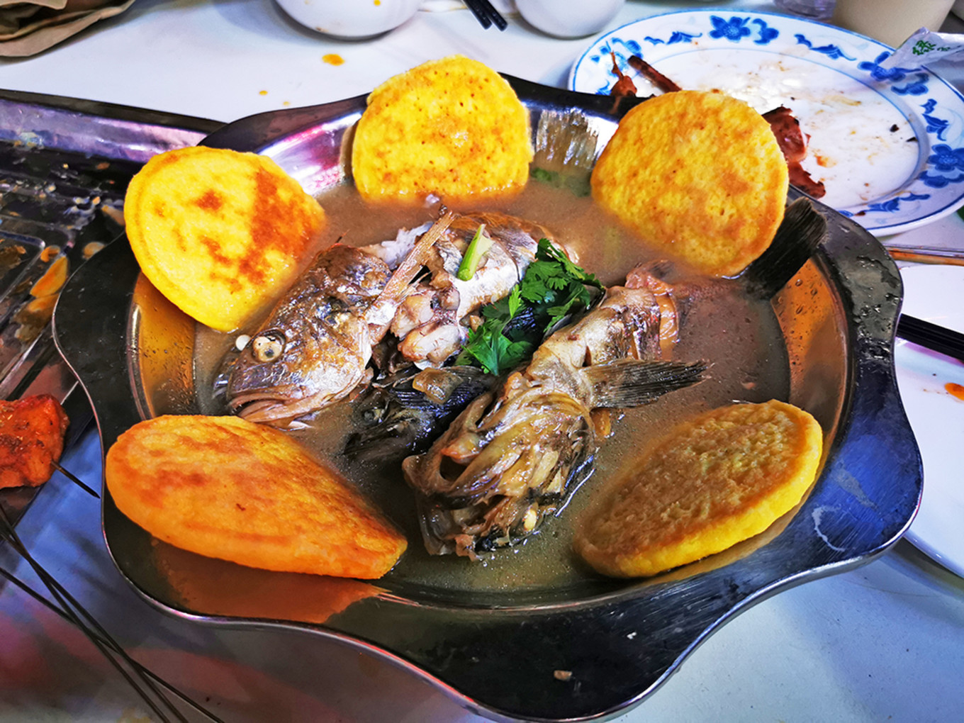 這里的海鮮,味道其實不錯,特別是對我這種吃慣了地道膠東口味的人,蠻喜歡。不過這些菜往往沒什么賣相,比如我發(fā)的這張圖——從盤子到盤子里的魚的表情,都散發(fā)著一種濃濃的土味高級感。