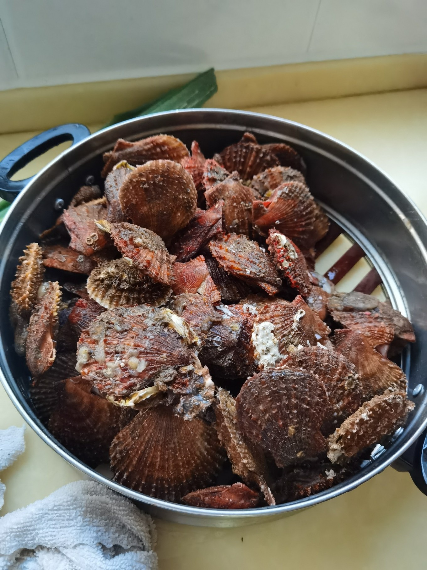 海螺大概是大的35元。海島這片海域自產(chǎn)扇貝和海帶兩種,所以大家必須吃扇貝,味道就是不一樣!