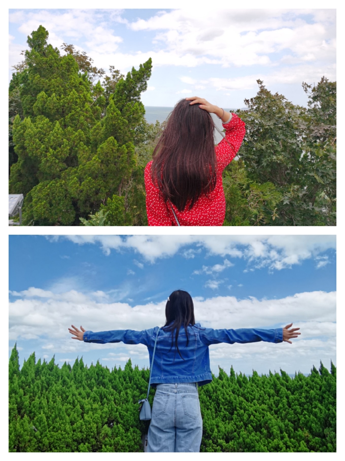 第二天早上睡起來磨蹭出門,島上果然起了風,游客服裝開始五花八門,在烽山林海拍照的時候為了好看,咬咬牙脫了牛仔外套,穿著雪紡襯衫拍了兩張,拍完一扭頭,旁邊穿著羽絨服的阿姨看著我們眼睛里是滿滿的欲言又止