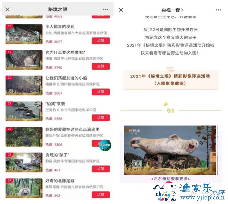 經(jīng)過(guò)初篩、復(fù)評(píng)層層選拔、精挑細(xì)選,長(zhǎng)島“斑海豹”視頻從156期《秘境之眼》節(jié)目脫穎而出,成功入圍32強(qiáng)。央視頻APP平臺(tái)央視一套特設(shè)置評(píng)選區(qū)對(duì)最終入圍節(jié)目公開(kāi)點(diǎn)贊,評(píng)選自2021年5月22日(生物多樣性日)9:00至6月10日24:00向大眾展開(kāi),最終結(jié)果6月12日(文化和自然遺產(chǎn)日)揭曉,屆時(shí)將根據(jù)最終點(diǎn)贊票數(shù)決出一等獎(jiǎng)1名、二等獎(jiǎng)2名、三等獎(jiǎng)3名,優(yōu)勝獎(jiǎng)26名。