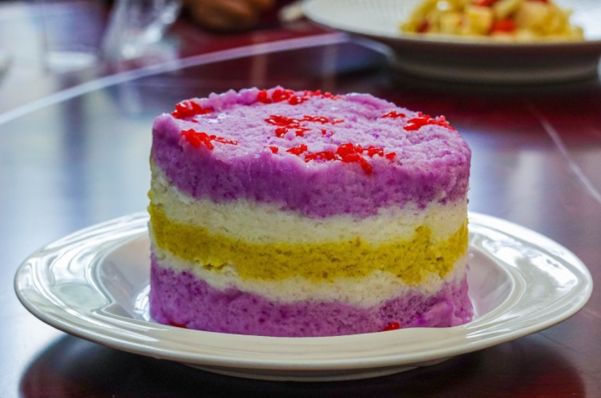 沖沖糕,源于黔南布依族苗族自治州獨山縣,有百余年歷史。制作工具是采用棕樹木制成的,分為隔板、蒸籠、木棒三大件。其中隔板略小于鍋口,將之架于蒸鍋口上,起密封和支撐作用,板面根據(jù)能容納小蒸籠的個數(shù)來鉆氣眼;蒸籠形如腰鼓,一般高約十厘米、直徑六厘米左右。以中間穿上無數(shù)小孔的鐵板作甑底,用時只需將籠罩在隔板氣眼上即可。質(zhì)柔軟香甜,色淡黃中偏紅,地方味濃厚,口感有韌性。