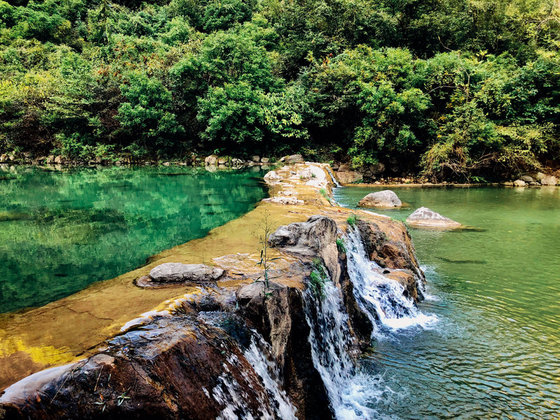 兩條小溪自東西兩邊流過石階,于平緩處匯集成一條大的瀑布跌落而下,看上去就是渾然天成的一個(gè)“Y”字。瀑布高10余米,落下深五六米的碧潭之中,瀑、潭水質(zhì)清澈,水面寬闊,甚為清涼。