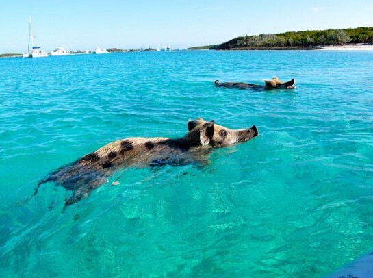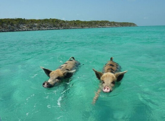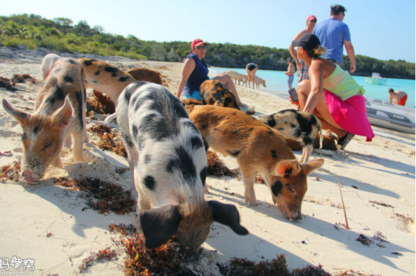 巴哈馬豬島,那里了無人煙卻有大量的豬聚居。它們?cè)谒墟覒颍扇航Y(jié)伴地游泳,或在沙灘上午睡和曬日光浴。據(jù)說這些豬是多年前水手途經(jīng)該島時(shí)放下,希望成為日后航海時(shí)的食物補(bǔ)給地,但水手并無回來,豬群在島上繁衍,堪稱全球最幸福的豬。