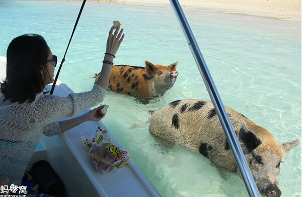 這群野生的豬過著無憂無慮的生活,在巴哈馬群島附近清澈見底的加勒比海,它們擅長(zhǎng)游泳,深受當(dāng)?shù)厝撕陀慰偷南矏?。豬仔們會(huì)在船邊游來游去,管人要吃的。