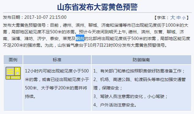 7日晚上21:00山東省氣象臺發(fā)布大霧黃色預警信號:目前,德州、濱州、聊城、濟南和淄博等市已出現(xiàn)能見度低于1000米的大霧,局部地區(qū)能見度不足500米的濃霧。