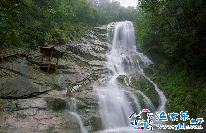 該疊高6米許,由于巖口高凹不平,迫使水流分散,數(shù)瀑爭泄,激浪翻滾,猶如眾龍戲水。水注仙人盆,合為一瀑,是為三疊,其落差達80余米。水大崖峻,飛流直下,俯沖谷底,洶涌澎湃,猶如萬馬奔騰。