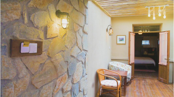 民宿客房及咖啡吧、紅酒吧、書吧等其它功能區(qū)以自然、原生態(tài)、低碳、環(huán)保為設(shè)計(jì)理念,長島旅游在保留原有建筑石墻灰瓦大梁的基礎(chǔ)上進(jìn)行了二次創(chuàng)作,搭配上古樸的裝飾、老式家具等,既古典又韻味十足,奠定了壹號(hào)院靜逸質(zhì)樸的情懷。