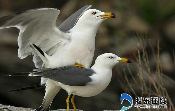 四月中下旬是黑尾鷗是交配高峰期,長島民宿整個白天都可以看到大量的黑尾鷗交尾行為。雌雄雙鳥交尾之前相互交替鳴叫,然后雄鳥飛到雌鳥背上先站立二三十秒鐘,然后雄鳥像原地