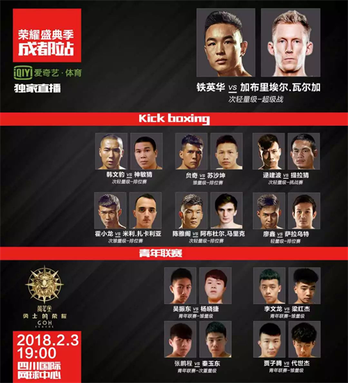 2月3日,在成都站比賽中,勇士榮耀全球聯(lián)盟大東翔俱樂部小虎鐵英華將拳力出征對陣前世界第一加拿大拳王加布里埃爾·瓦爾加。"跳膝王"贠奇將跨級別迎戰(zhàn)泰國倫披尼拳場冠軍蘇沙坤,韓文豹自武當(dāng)山站后再次出征對陣泰國選手神敏猜,逯建波、霍小龍、陳雅閣、張鵬程拳力出征,迎戰(zhàn)多國悍將!2月3日19:00,山東長島民宿讓我們相約四川國際網(wǎng)球中心,為勇士們加油喝彩!