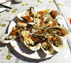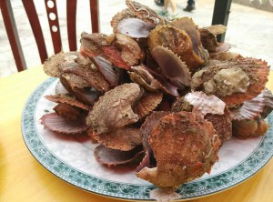 大哥每天提供新鮮的海鮮食材:扇貝、海虹、蠔、海螺、黃魚、黑魚、比目魚、海膽、……我也記不全了,大姐變著花樣的做成美味,每頓正餐我們好像都沒吃光過,